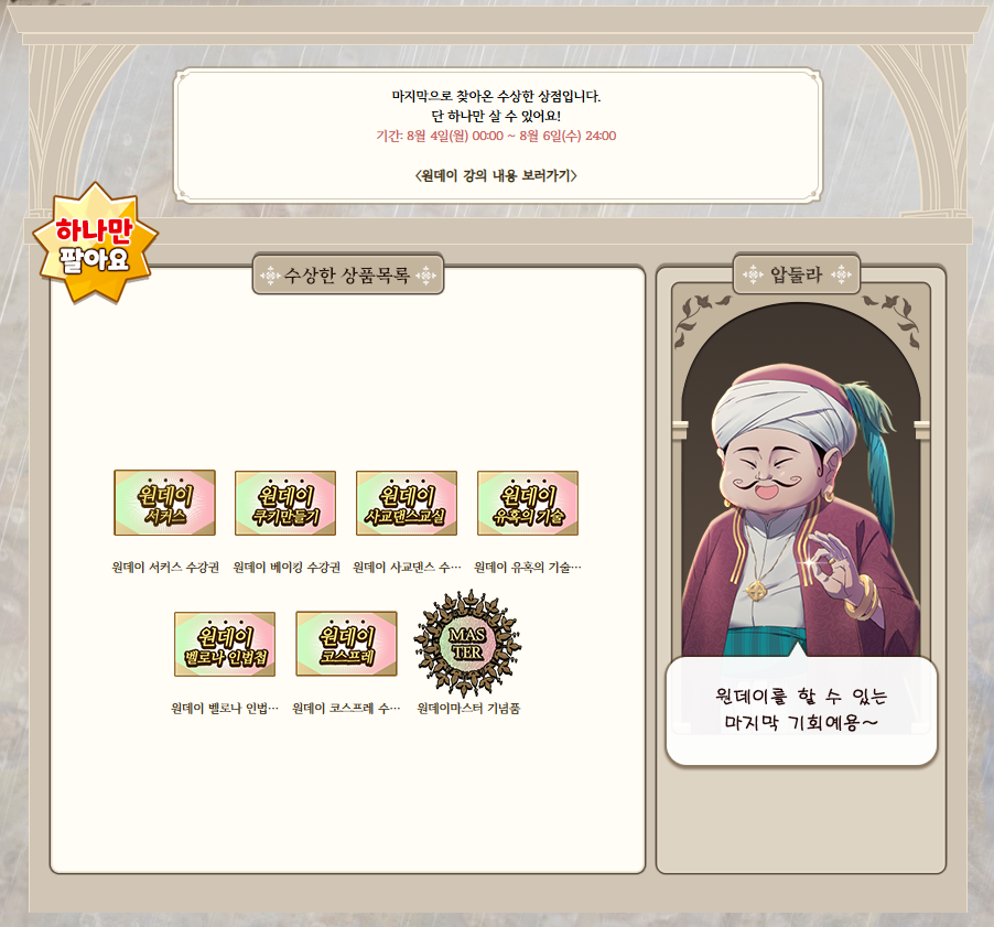 원데이마스터 기념품 챕터8 안에 원데이 강의 6개를 이미 모두 수강한 사람만 살 수 있는 기념품. (더이상 배울 원데이 클래스가 없다. 멋지다. ※명성은 추가되지 않습니다.) |