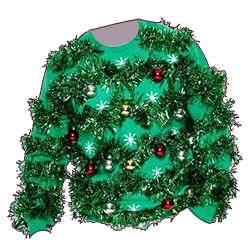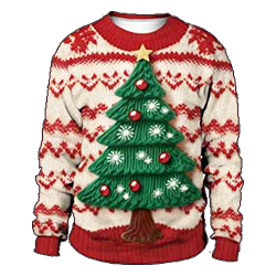 반짝이는 어글리 스웨터. 작은 트리를 품자. |