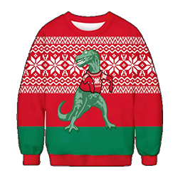 웃긴 어글리 스웨터. 공룡이 그려져 있다. |